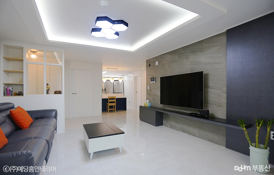 발코니에 폴딩도어를 설치하여 공간을 자유롭게 확장할 수 있도록 한 깔끔한 마감의 거실입니다. 간접등박스를 제작하여 간접조명으로 빛이 은은하게 퍼져나가도록 했고 화이트 톤 타일 마감으로 개방감을 살렸습니다. 반대로 가구는 짙은 컬러로 채택하여 가벼울 수 있는 공간에 무게감과 안정감을 주어 밸런스를 맞추었습니다.