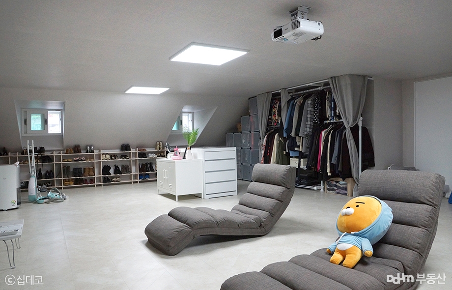 넓은 공간을 어떻게 하면 잘 활용할까 생각하다 빈 벽면에는 스크린을 설치해 영화관을 조성하고 반대쪽 벽면에는 드레스룸을 만들어 알차게 꾸민 드레스룸 겸 취미 공간입니다.