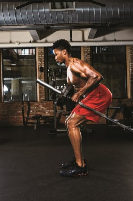 운동 방법: 바벨을 랜드마인과 연결하자. (랜드마인이 없다고? 그렇다면 바벨의 한쪽 끝을 수건으로 감아서 이를 대체하자.) 반대쪽 끝에는 적절한 무게의 중량을 끼운다. 이제 바벨과 수직 방향으로 서자. 바벨 가까운 곳의 바를 잡고 벤트오버 로우를 할 때처럼 자세를 취한다. (몸통을 단단히 유지하기 위한 한 가지 팁은 바를 잡지 않은 손으로 복부나 허리를 잡는 것이다.) 그런 다음 플레이트가 늑골에 닿을 정도까지 로우 동작을 수행하자.