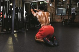 운동 방법: 케이블 도르래를 가장 높은 위치로 맞추고 로프 손잡이를 연결하자. 약 1미터 앞에 무릎을 대고 자리하자. 무릎을 꿇은 상태에서 로프를 쥐고 몸을 앞으로 45도가량 기울이자. 팔꿈치는 아주 살짝만 굽힌 상태에서 로프가 가슴 높이에 올 때까지 아래로 당기자.