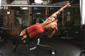 운동 방법: 각도 조절이 가능한 벤치가 있어야 한다. 벤치를 케이블 스테이션 사이에 놓고 45도로 설정하자. D-손잡이를 케이블 도르래에 연결하고 가장 높은 위치로 설정하자. 벤치 위에 옆으로 눕고, 위쪽 손으로 핸들을 잡자. 팔을 완전히 뻗은 상태에서 매 동작을 시작한다. 중량을 흉곽을 향해 당기자. 완전한 수축이 이뤄지면 잠시 정지하고, 다시 시작 자세로 돌아가자.